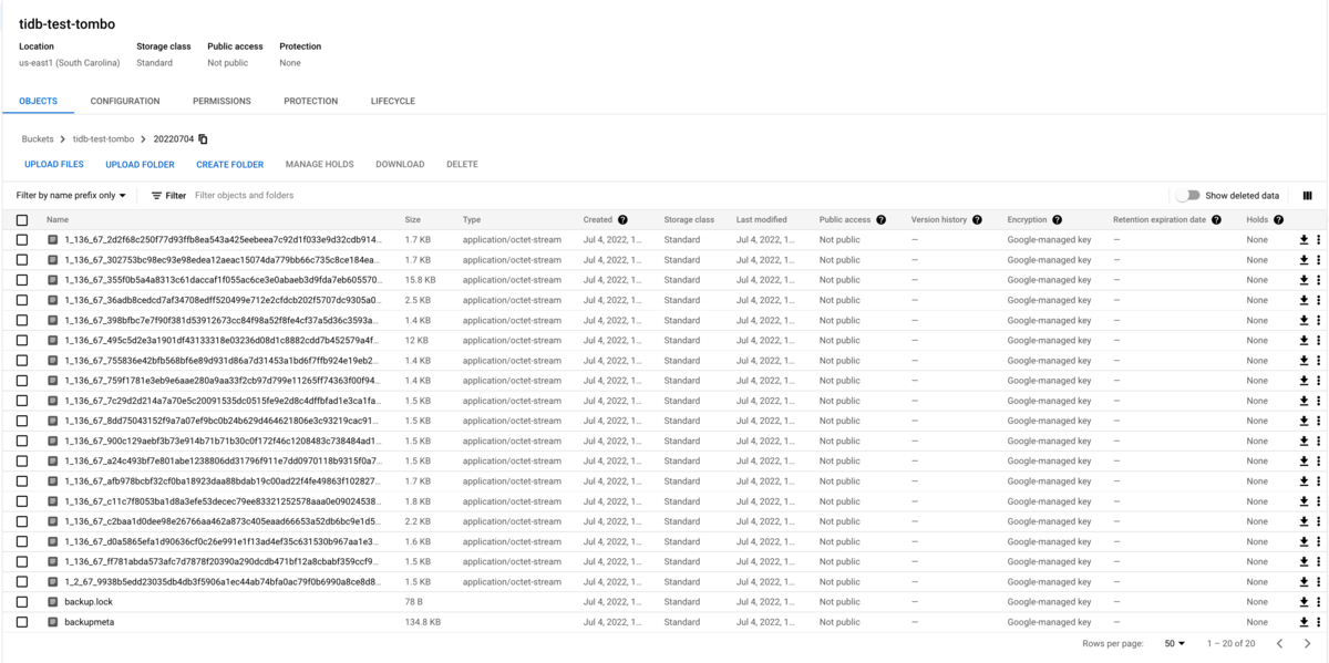 tiup br restore full \ --pd "pd-01-tidb-test:2379" \ --storage "s3://tidb-test-tombo/20220704" \ --s3.endpoint "https://storage.googleapis.com" \ --s3.region "us-east-1" \ --log-file restoretable.log tiup is checking updates for component br ... Starting component `br`: /home/tom_bo_underbar/.tiup/components/br/v6.1.0/br restore full --pd pd-01-tidb-test:2379 --storage s3://tidb-test-tombo/20220704 --s3.endpoint https://storage.googleapis.com --s3.region us-east-1 --log-file restoretable.log Detail BR log in restoretable.log Full Restore <-------------------------------------------------------------------------------------------------------------------------------------------------------------> 100.00% [2022/07/04 14:37:20.842 +00:00] [INFO] [collector.go:69] ["Full Restore success summary"] [total-ranges=2] [ranges-succeed=2] [ranges-failed=0] [split-region=221.517µs] [restore-ranges=1] [total-take=1.940572473s] [Size=1549] [BackupTS=434358305207877634] [total-kv=3] [total-kv-size=75B] [average-speed=38.65B/s] [restore-data-size(after-compressed)=1.549kB]